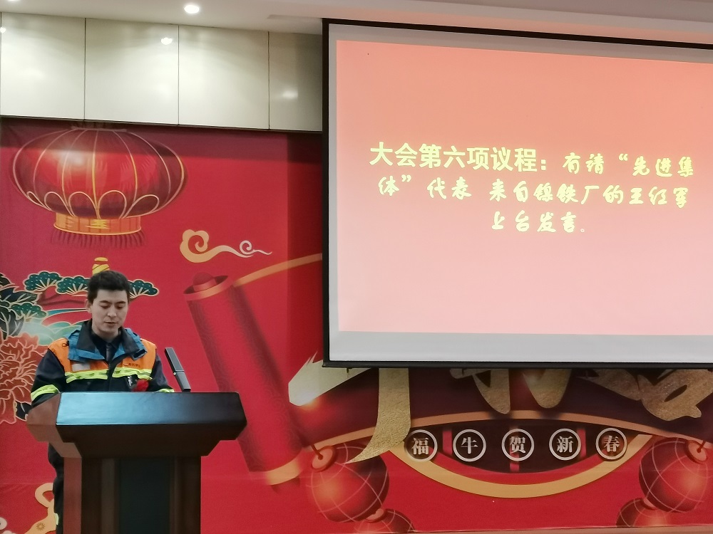 先进集体代表镍铁部二期脱硫除尘班组的王红军、炼钢部先进员工代表李祥进行发言。王红军表示:获得先进集体的荣誉,离不开脱硫除尘班组每位成员的努力,经过技改调试,员工解决了生产工艺不成熟给调试带来的各项难题,不断改进脱硫工艺,脱硫效率有了明显提高;今后脱硫除尘班组将把荣誉作为新的起点,不骄不躁,做到在线数据无超标,保障生产事故向零迈进。