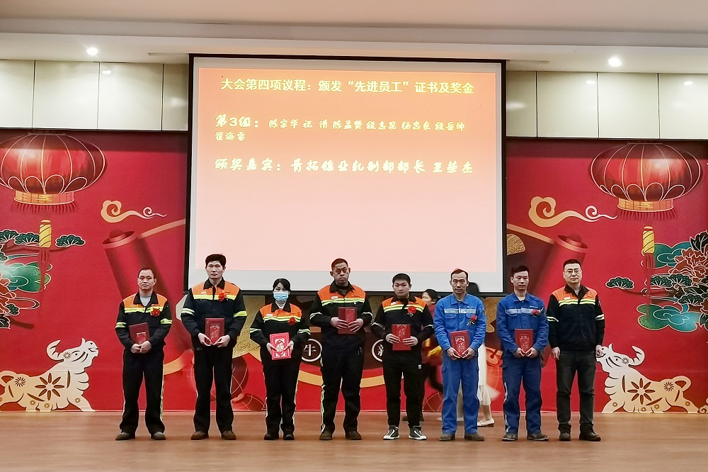 公司副总经理冯绍国宣读表彰决定。李高荣、冯绍国分别为获得“先进集体”的200系炉料车间、300系普工班组、镍铁厂5个班组、炼钢厂9个班组、轧制部4个班组、物流部成品棒材储运及堆场铲车2个班组、装备部钢构维修班组和电气设备部装配车间等集体代表颁发了荣誉证书及3000元奖金。各部门部长分别为70名先进员工颁发了荣誉证书及1000元奖金。