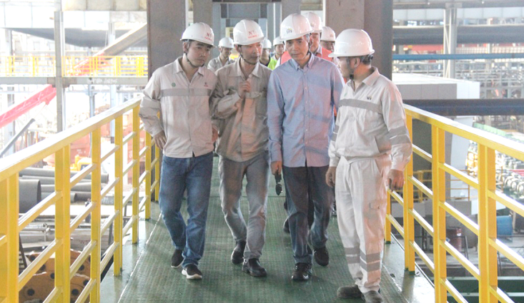 7月8日下午,壹号娱乐-com钢铁董事局主席项光达一行莅临印尼经贸合作区壹号娱乐-com园区参观指导,全面了解印尼广青镍业有限公司(GCNS)炼钢事业部、热轧事业部的生产情况及印尼壹号娱乐-com不锈钢有限公司(ITSS)炼钢事业部建设情况,园区项目总指挥伍华弟等全程陪同。