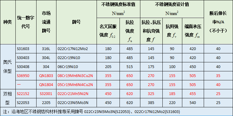 该标准中不锈钢芯板建筑结构材料全部推荐采用耐蚀性304级别及以上的不锈钢,其中包括304、304L、316L、2205以及青拓集团全球首发的高强度、高耐蚀、高性价比的新型QN系不锈钢,如QN1803(08Cr19Mn6Ni3Cu2N)、QN1804(05Cr19Mn6Ni4Cu2N),尤为重要的是,其抗拉、抗压和抗剪切强度设计值 是常规钢种304、304L的1.5倍甚至以上。此外,点蚀当量PREN超过304的高强度经济型双相不锈钢S32001(022Cr21Mn5Ni2N)也首次入围不锈钢建筑结构材料标准。